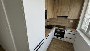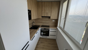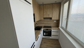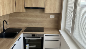 nová kuchynská linka na mieru so zabudovanými novými spotrebičmi (elektrická rúra, plynová varná doska, digestor, vstavaná chladnička s mrazničkou, vstavaná mikrovlnná rúra),