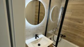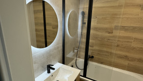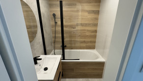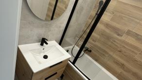 Vybavenie kúpeľne zahŕňa: vaňa, umývadlo so skrinkou, zrkadlo so svetlom, vývod na práčku,