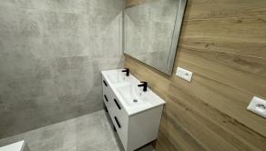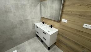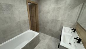 Vybavenie kúpeľne zahŕňa: vaňa, dvoj umývadlo so skrinkou, zrkadlo so svetlom, vývod na práčku,