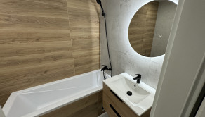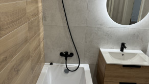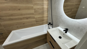 Vybavenie kúpeľne zahŕňa: vaňu, umývadlo so skrinkou, zrkadlo so svetlom, sklenenú zástenu, vývod na práčku,