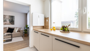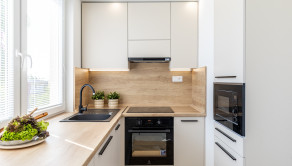nová kuchynská linka na mieru so zabudovanými novými spotrebičmi (elektrická rúra, elektrická sklo-keramická doska, digestor, vstavaná chladnička s mrazničkou, vstavaná mikrovlnná rúra),