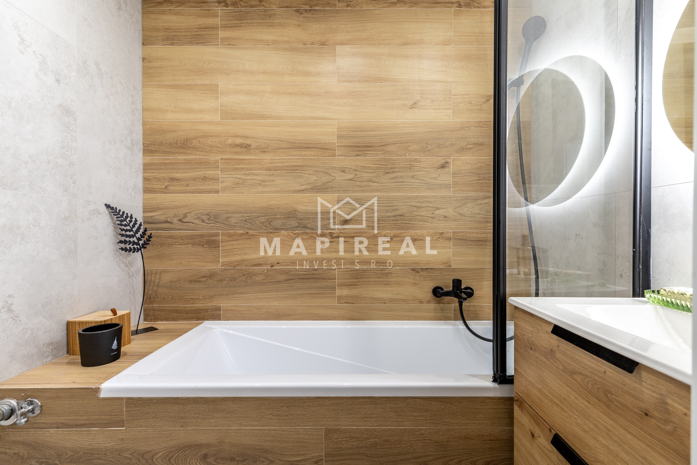 Vybavenie kúpeľne zahŕňa: vaňa, umývadlo so skrinkou, zrkadlo so svetlom, sklenená zástena, vývod na práčku,