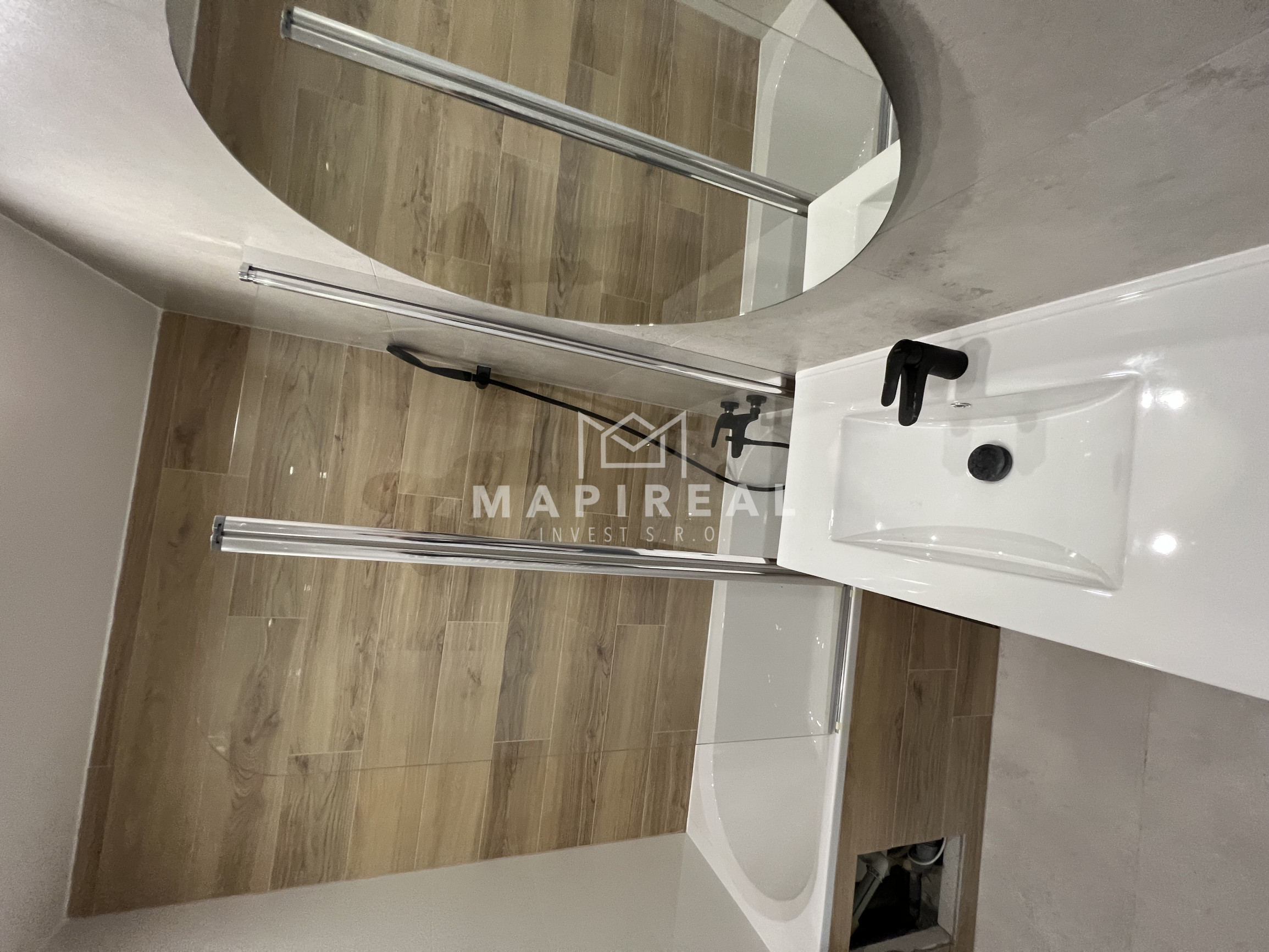 Vybavenie kúpeľne zahŕňa:  vaňa, umývadlo so skrinkou, zrkadlo so svetlom, sklenená zástena, vývod na práčku,