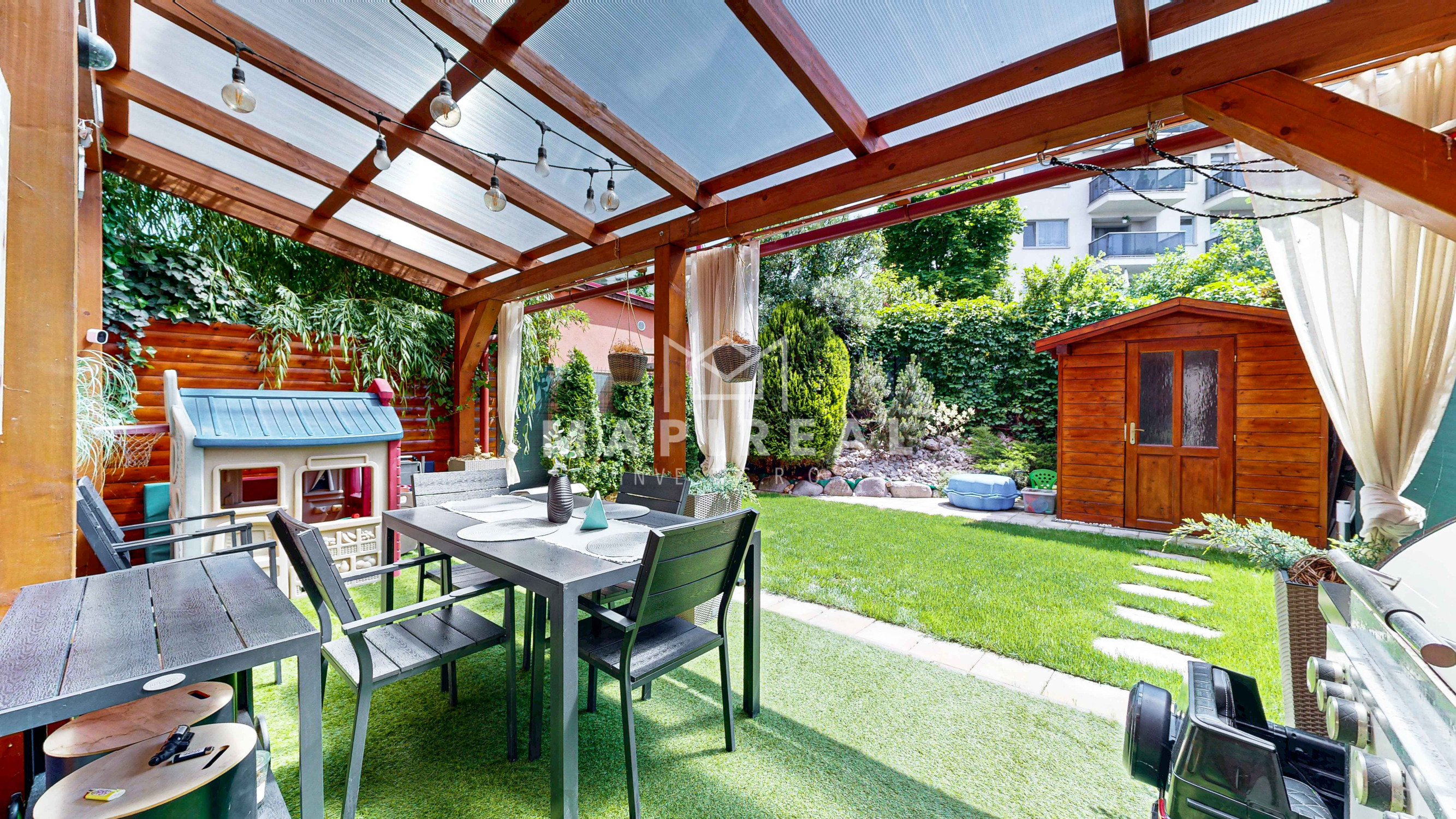 Záhrada: automatická kosačka, automatické zavlažovanie, osvetlenie, záhradný domček