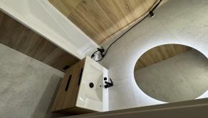 Vybavenie kúpeľne zahŕňa: vaňu, umývadlo so skrinkou, zrkadlo so svetlom, sklenená zástena, vývod na práčku,