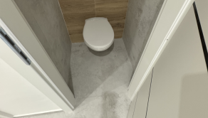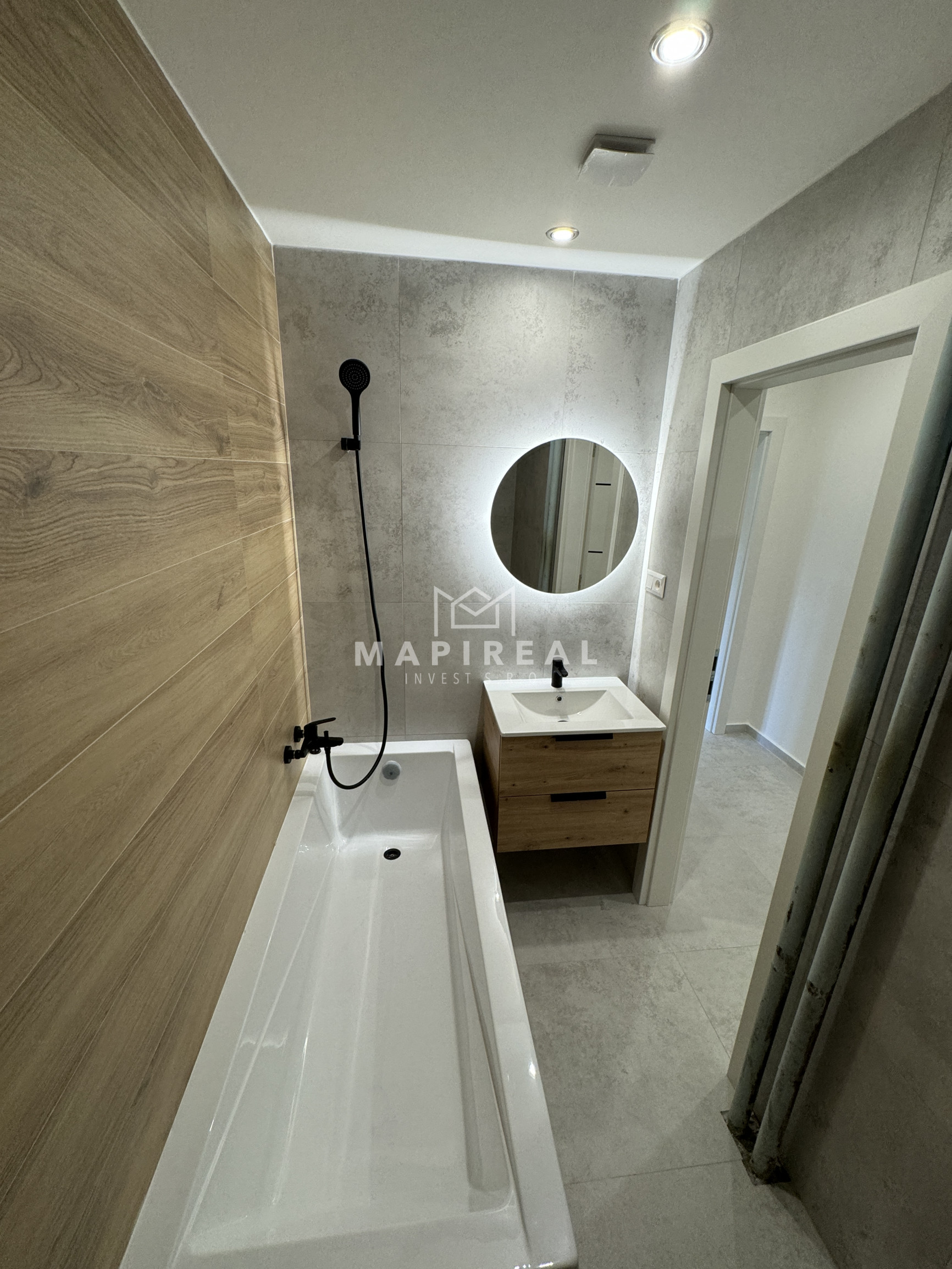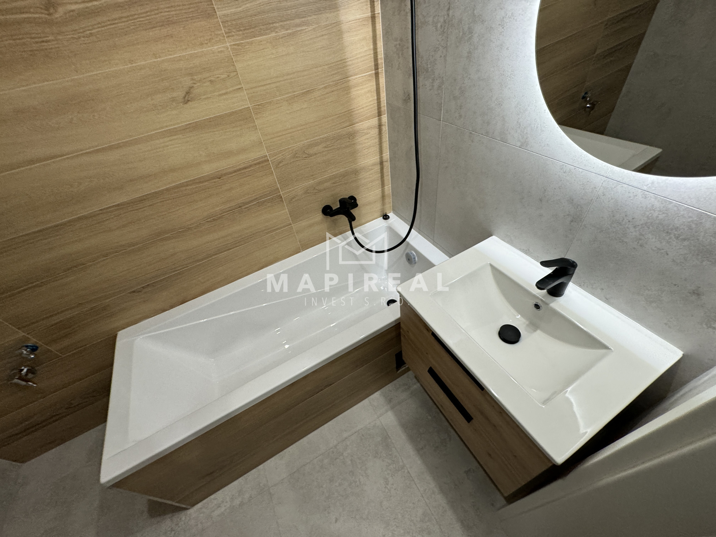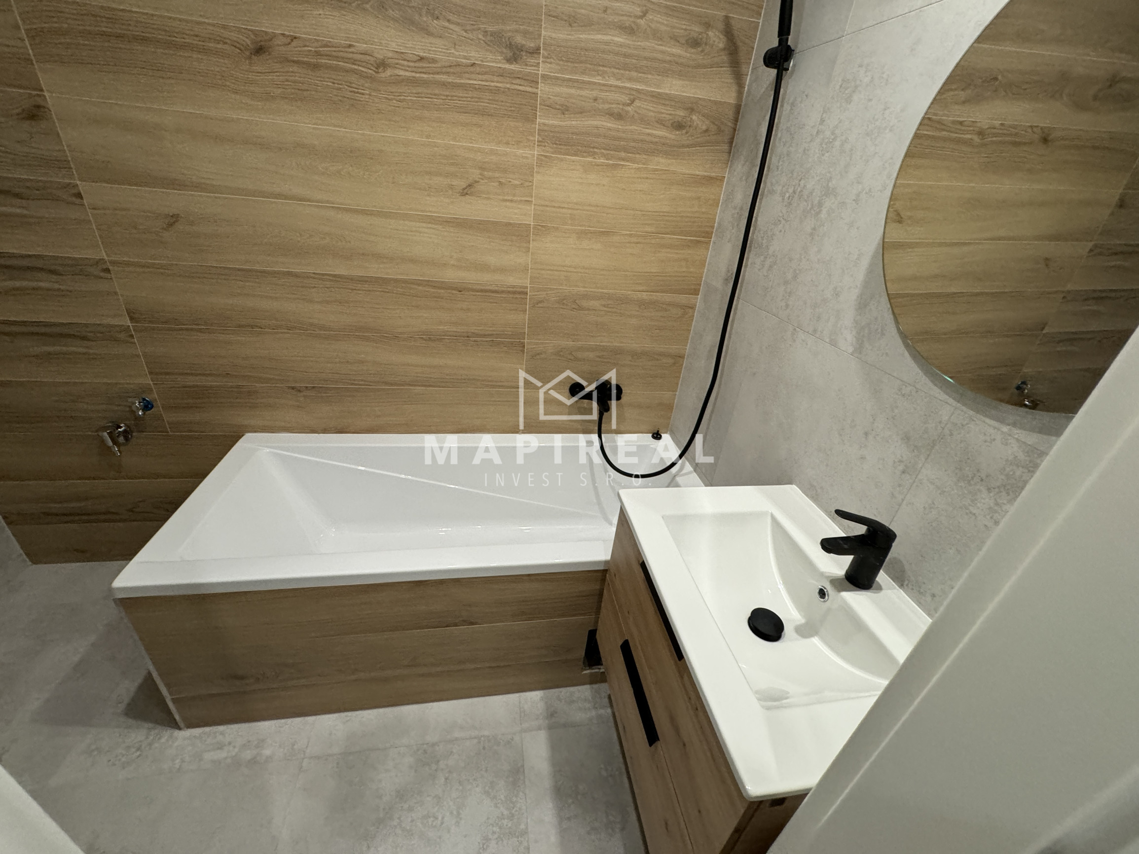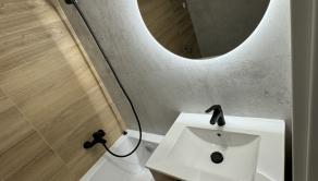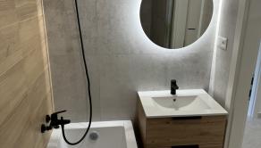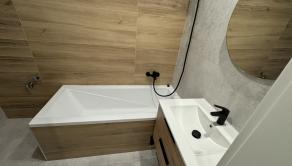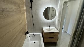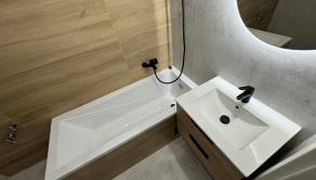 Vybavenie kúpeľne zahŕňa: vaňu, umývadlo so skrinkou, zrkadlo so svetlom, sklenená zástena, vývod na práčku,