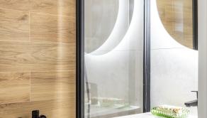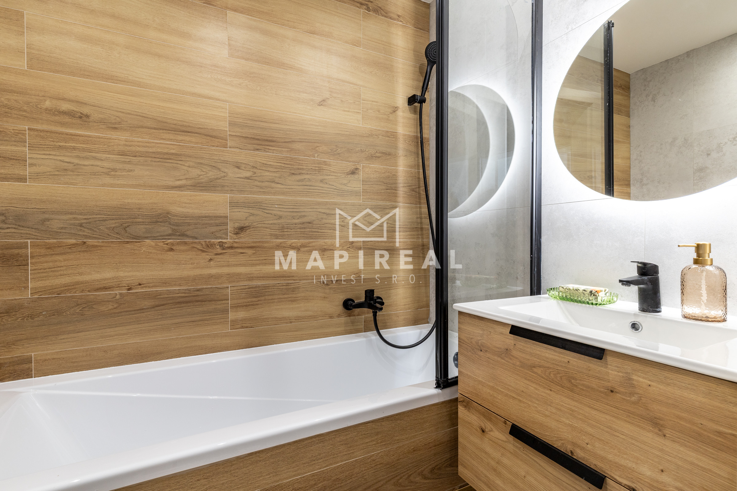 Vybavenie kúpeľne zahŕňa: vaňa, umývadlo so skrinkou, zrkadlo so svetlom, sklenená zástena, vývod na práčku,