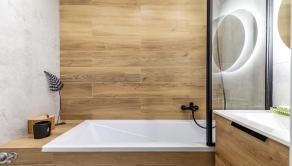 Vybavenie kúpeľne zahŕňa: vaňa, umývadlo so skrinkou, zrkadlo so svetlom, sklenená zástena, vývod na práčku,