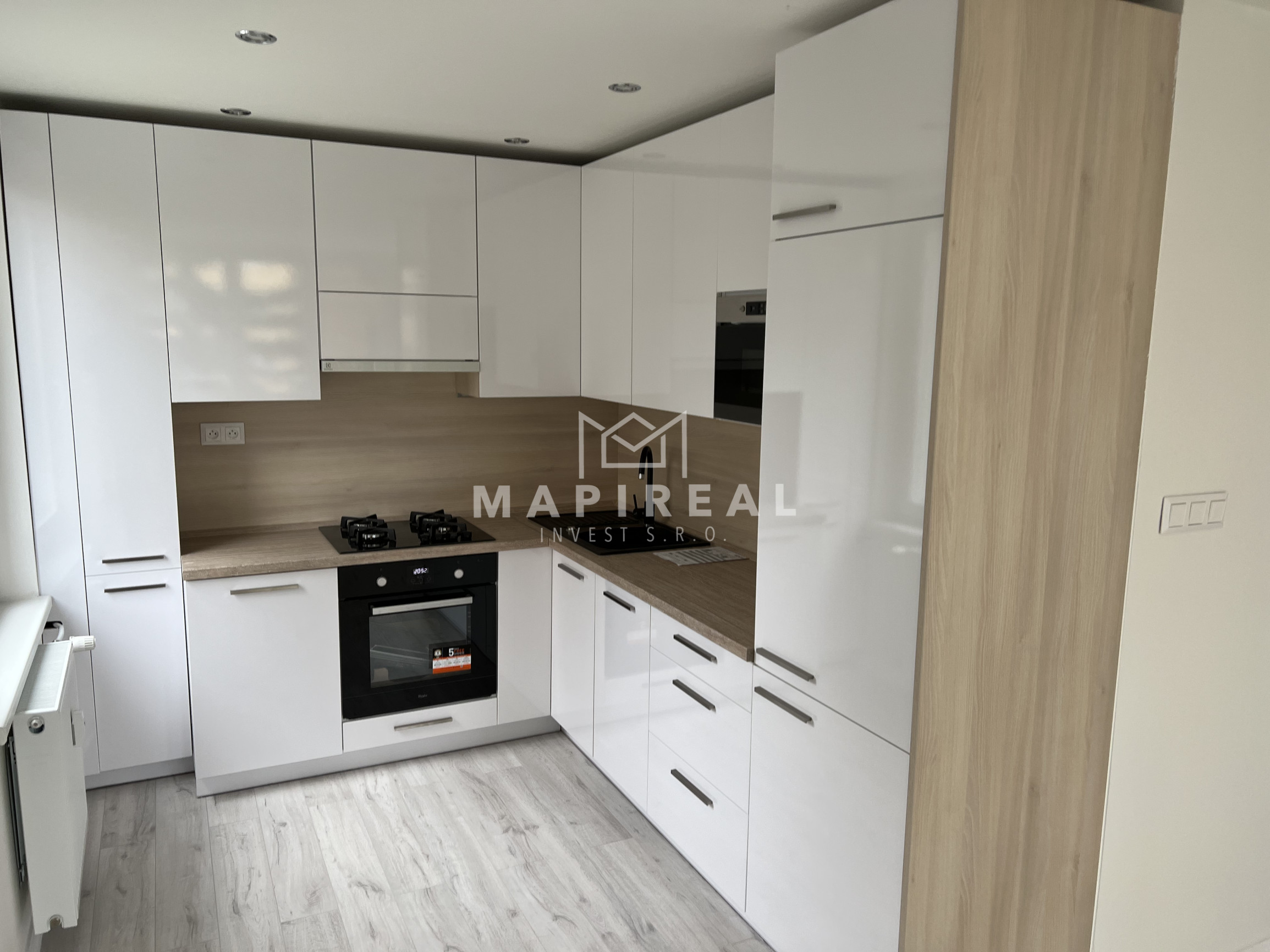 nová kuchynská linka na mieru so zabudovanými novými spotrebičmi (elektrická rúra, elektrická sklo-keramická doska, digestor, vstavaná chladnička s mrazničkou, vstavaná mikrovlnná rúra),