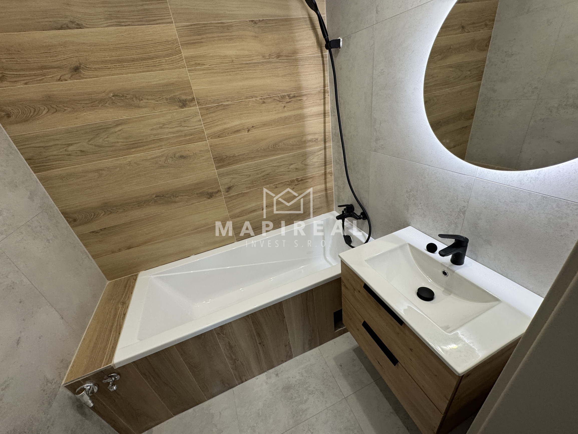Vybavenie kúpeľne zahŕňa: vaňu, umývadlo so skrinkou, zrkadlo so svetlom, sklenená zástena, vývod na práčku,
