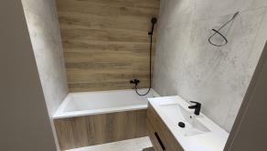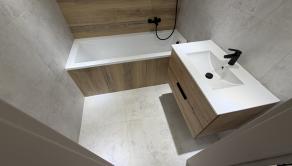 Vybavenie kúpeľne zahŕňa: vaňa, umývadlo so skrinkou, zrkadlo so svetlom, sklenená zástena, vývod na práčku,