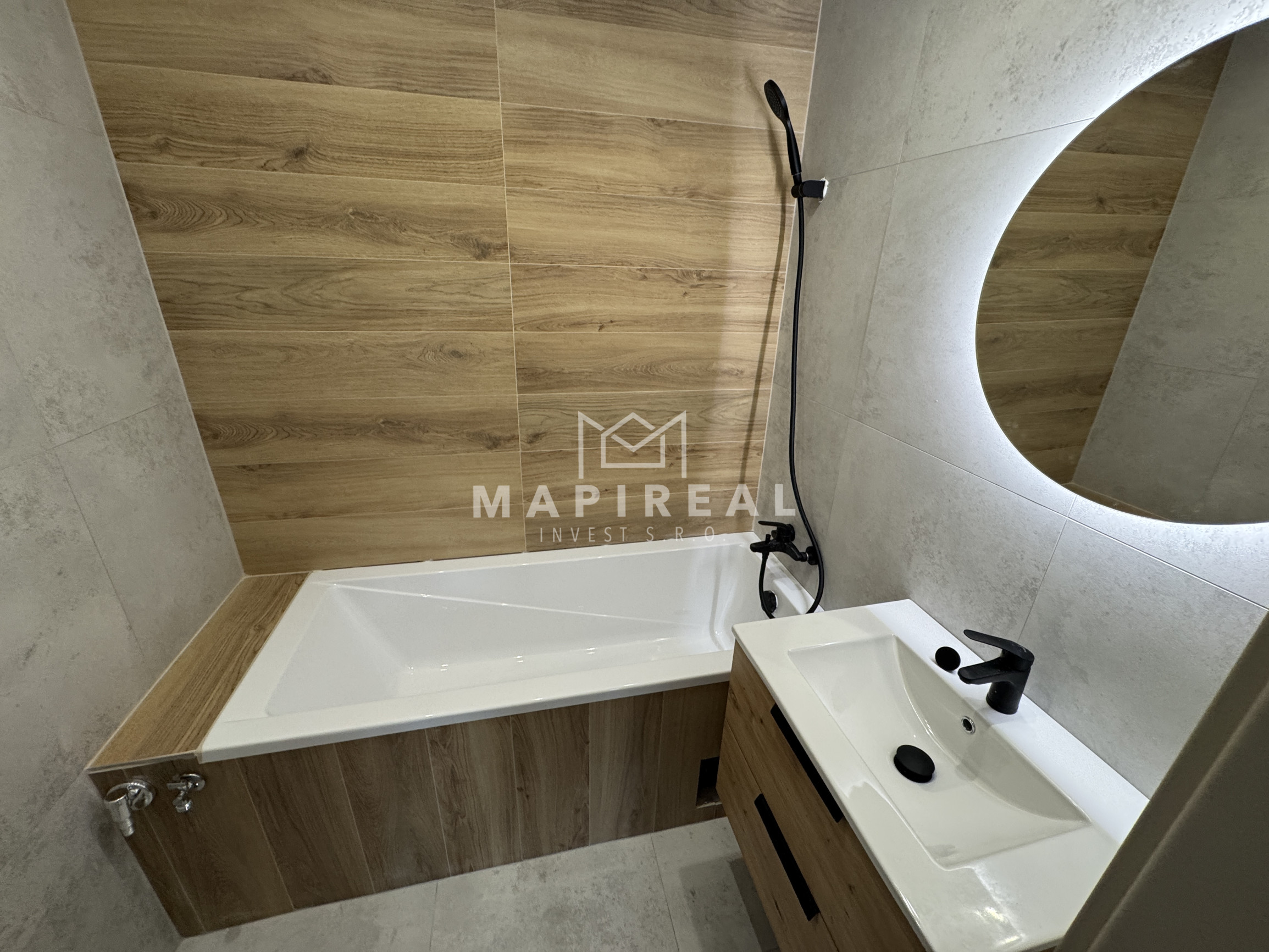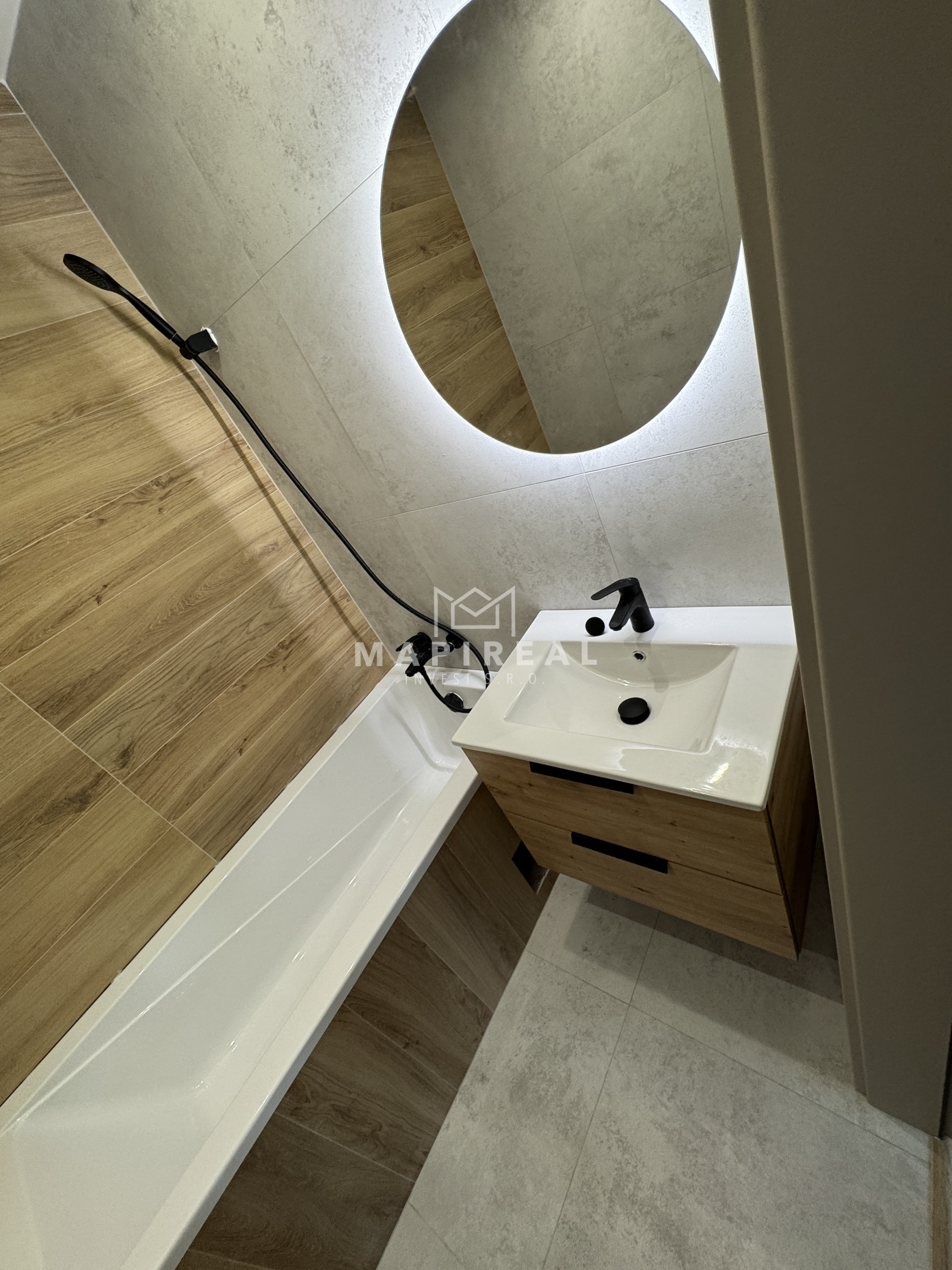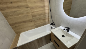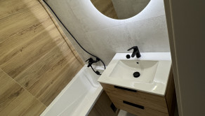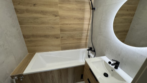 Vybavenie kúpeľne zahŕňa: vaňu, umývadlo so skrinkou, zrkadlo so svetlom, sklenená zástena, vývod na práčku,