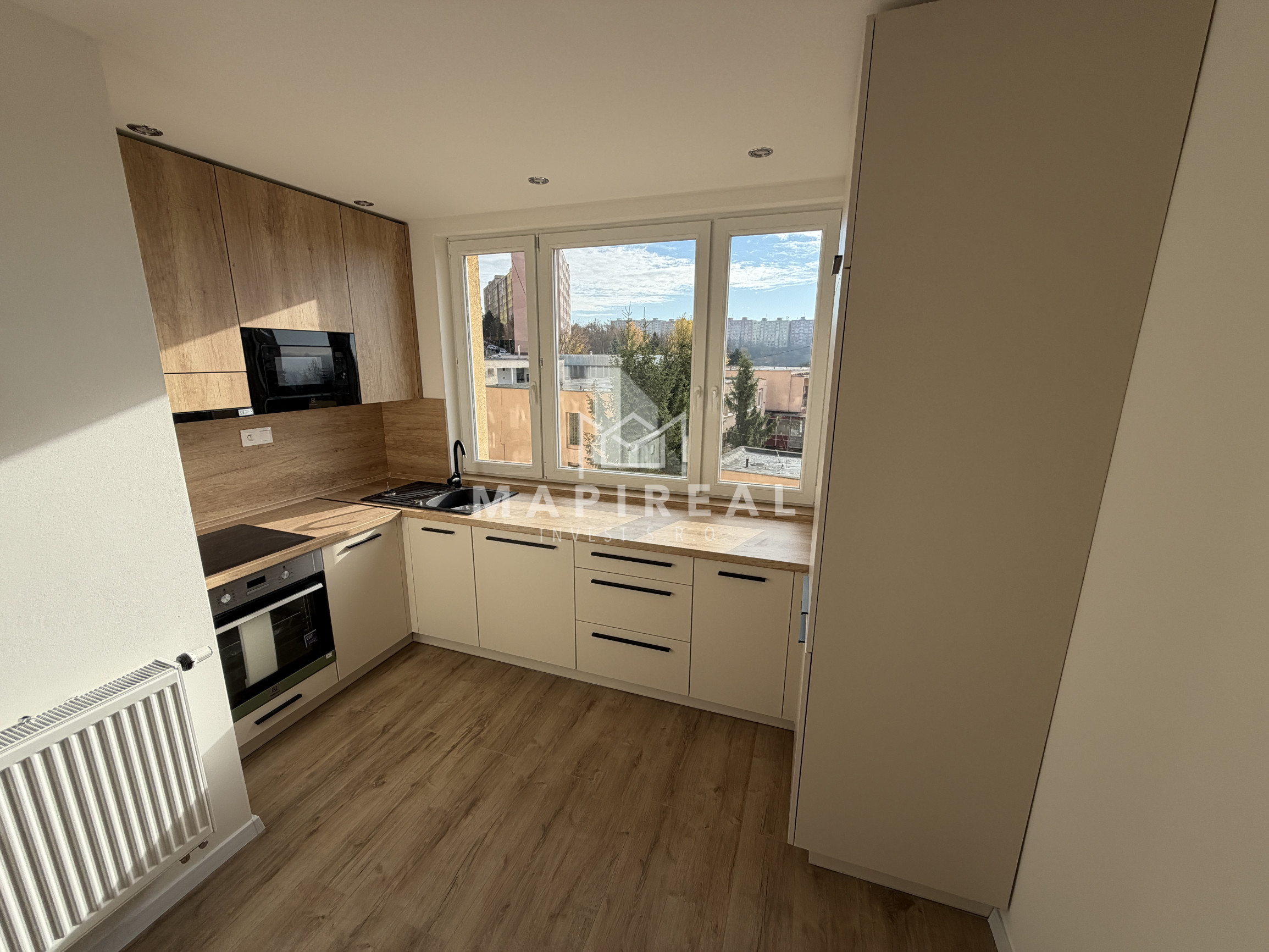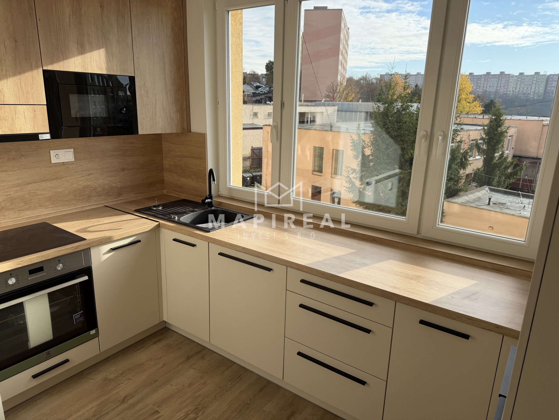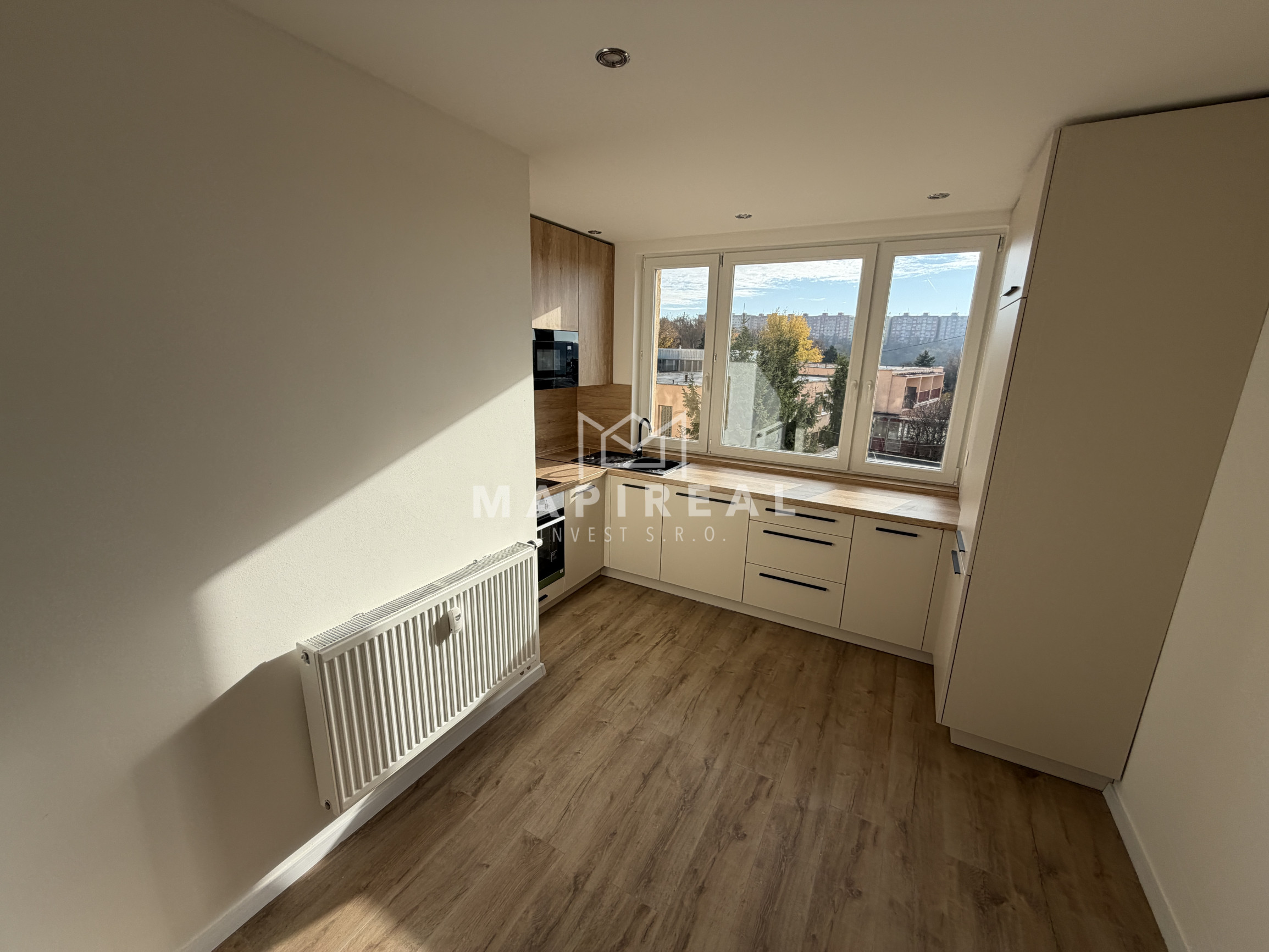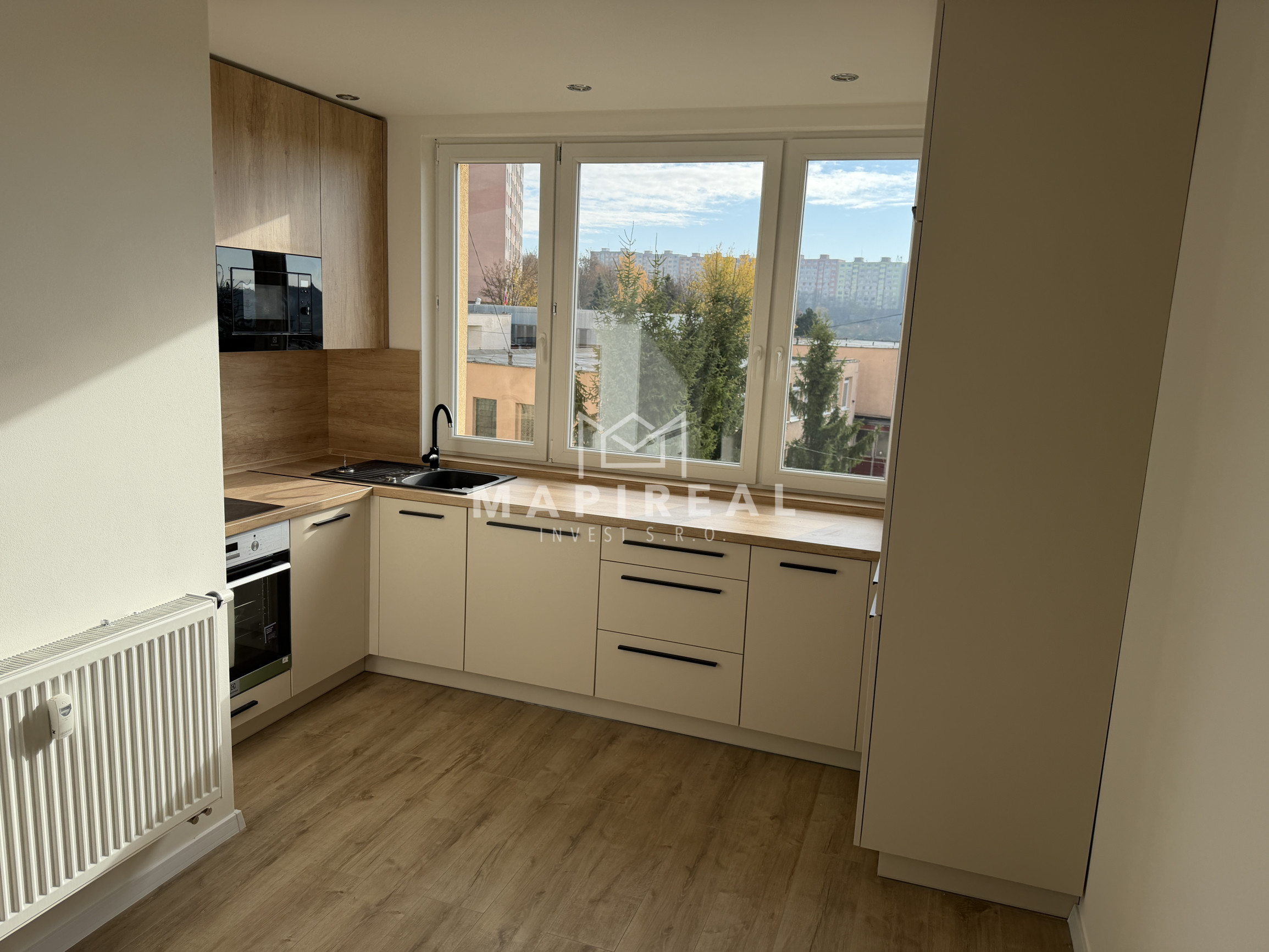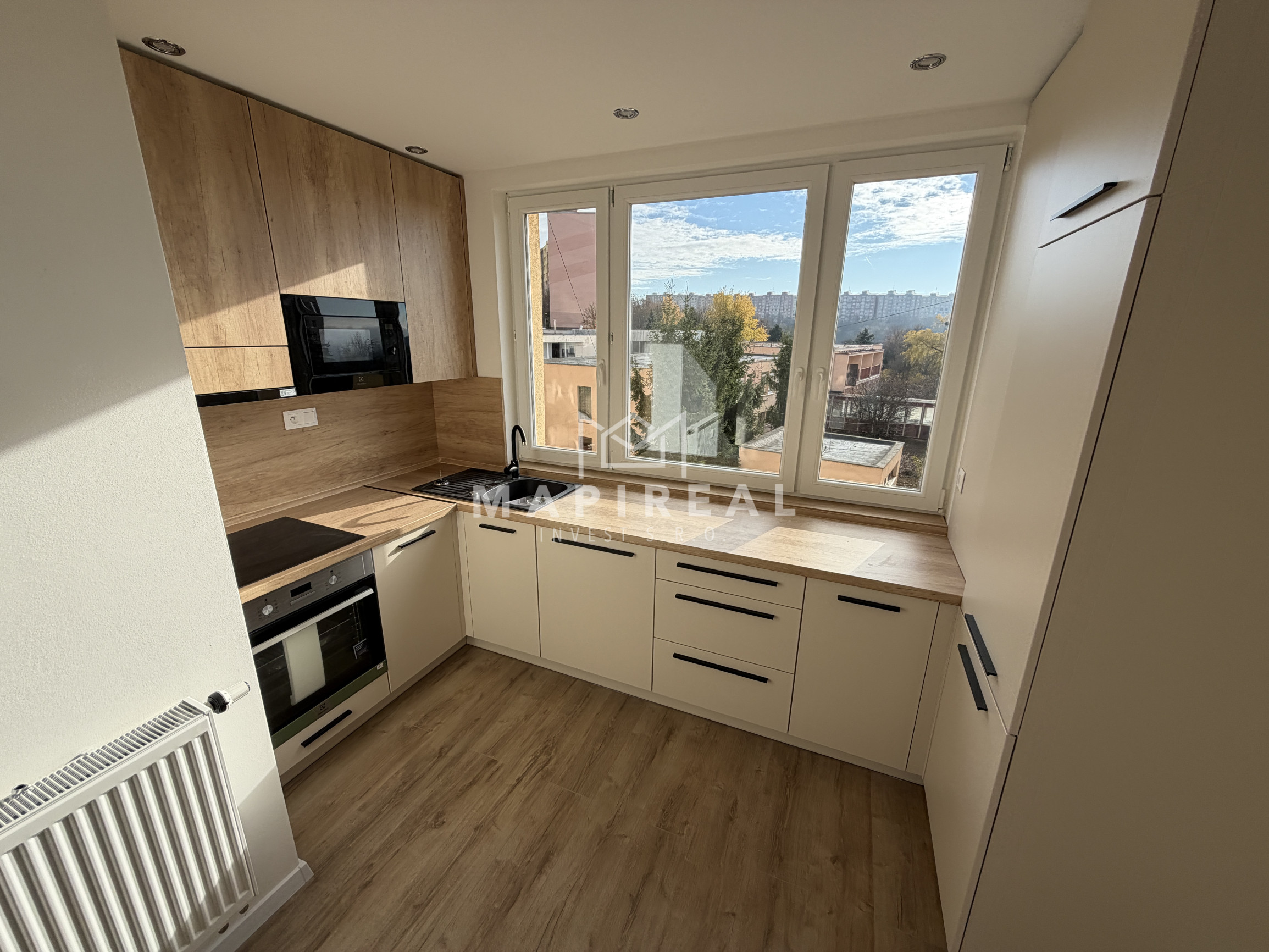nová kuchynská linka na mieru so zabudovanými novými spotrebičmi (elektrická rúra, elektrická sklo-keramická doska, digestor, umývačka riadu, vstavaná chladnička s mrazničkou, vstavaná mikrovlnná rúra),